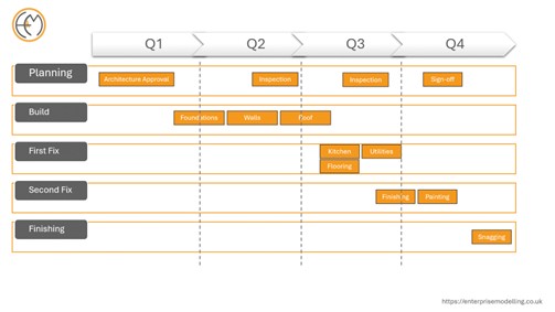 At the High Level your roadmap will represent planning, the number and type of house variations; land levelling/preparation; road layouts; infrastructure such as electricity, water, drainage and gas. And then of course the sales, marketing and grand opening milestones. These would be laid out as top level items that are to be executed in order of completion.
